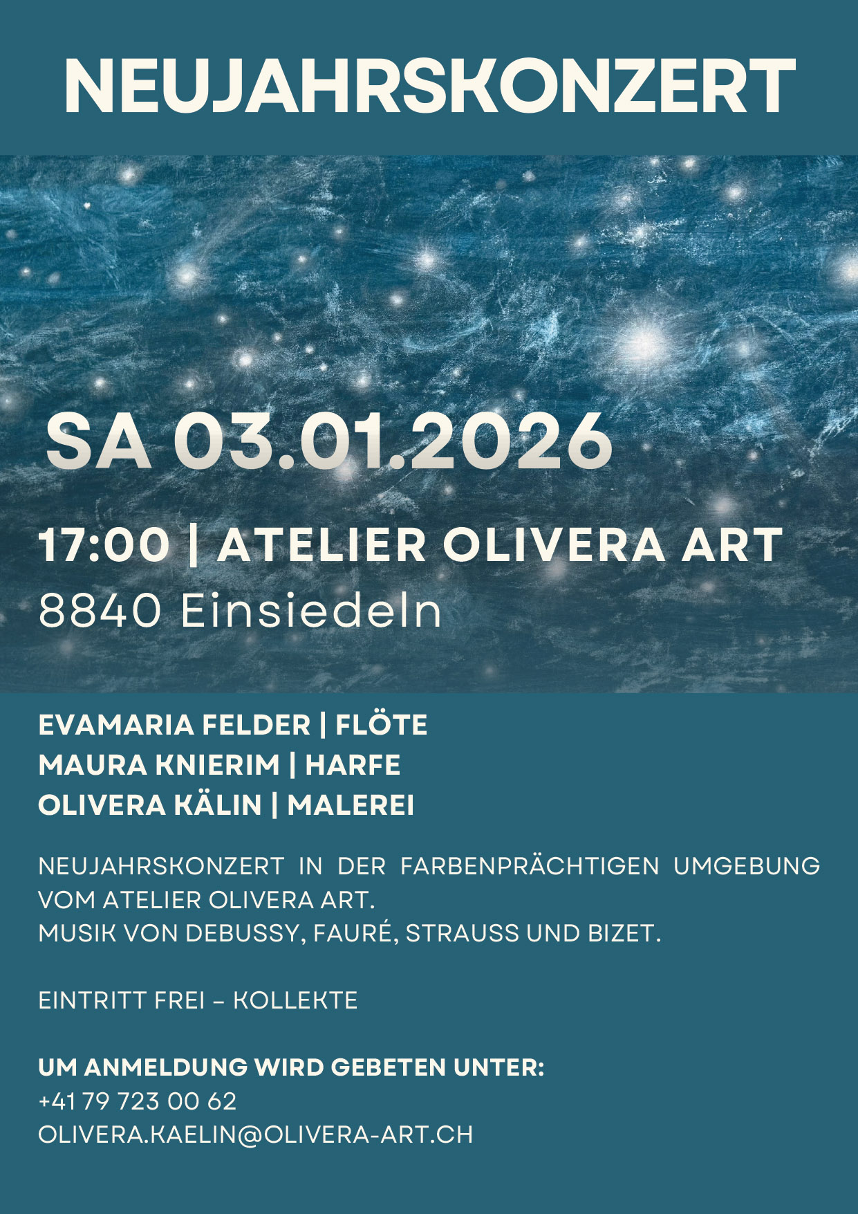 Atelier Olivera Art Klosterplatz, Einsiedeln, SchweizNeujahrskonzert des Ensembles nouveau pastel im Atelier Olivera Art in Einsiedeln.